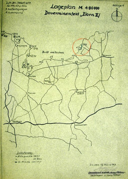 Plan de situation du champ de mines de l'ensemble fortifié du port de Plouescat codé A1, mars 1943, source Fort MontbareyImmatriculation
