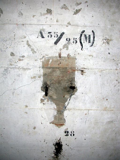 Le numéro de l'ensemble fortifié : "A 35" et le numéro du blockhaus : "25 et 28" sont peints au dessus du central téléphonique aujourd'hui disparuImmatriculation