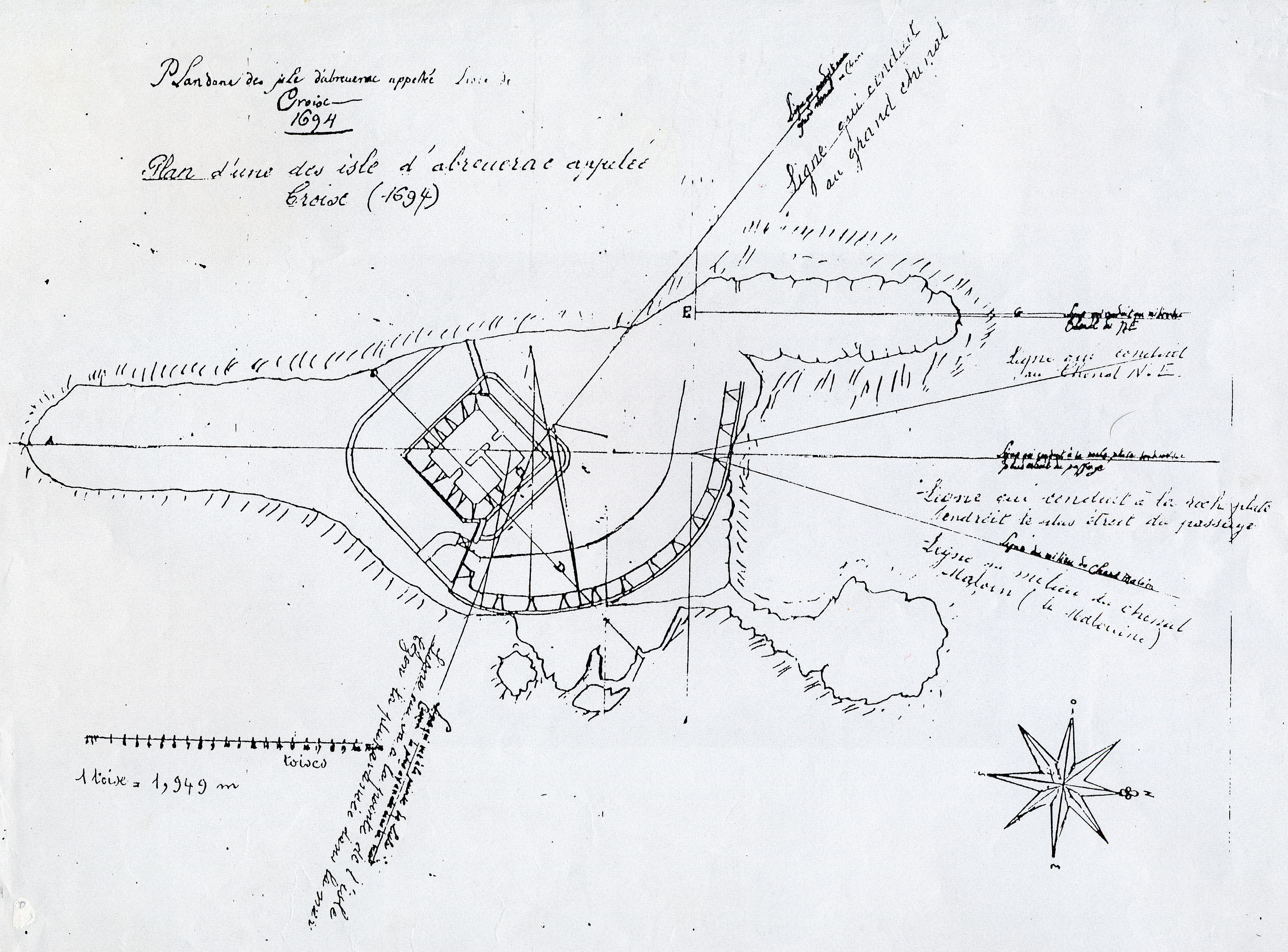 Plan du projet de fort (redoute ou tour) et batterie de canons sur l'île de Croix, Aber Wrac'h, 1694, par Paul Azur, in Cahier de Landéda, n° 7, sept. 1985, article de Georges Menut (association Cézon, document n° 7)Immatriculation