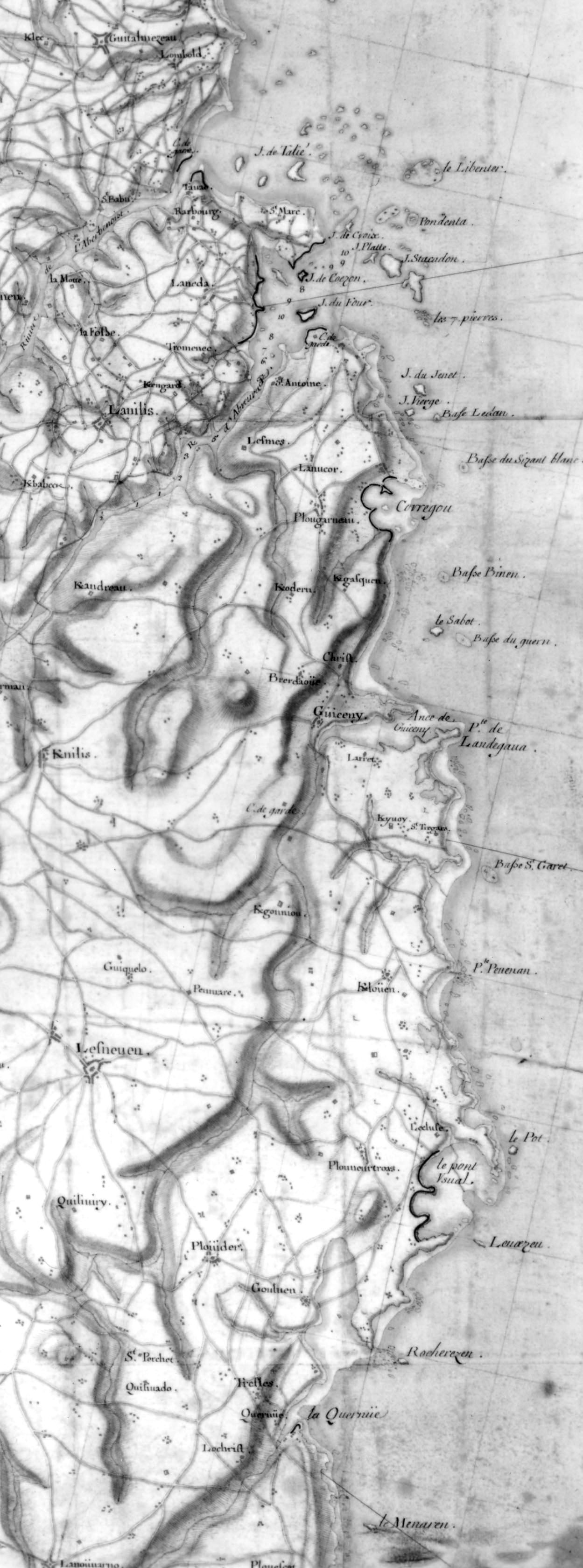 Extrait de la carte des environs de Brest : côte Nord, 1695, auteur non précisé, les retranchements sont représentés par un trait noir et les batteries en rouge, Service Historique de la Marine, Vincennes, portefeuille 46, division 2 (association Cézon, document n° 9)Immatriculation