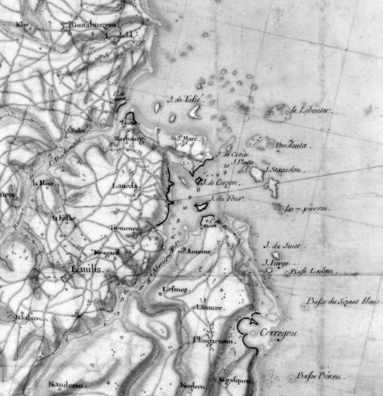 Extrait de la carte des environs de Brest : Aber Wrac'h, 1695, auteur non précisé, les retranchements sont représentés par un trait noir et les batteries en rouge, Service Historique de la Marine, Vincennes, portefeuille 46, division 2 (association Cézon, document n° 9)Immatriculation
