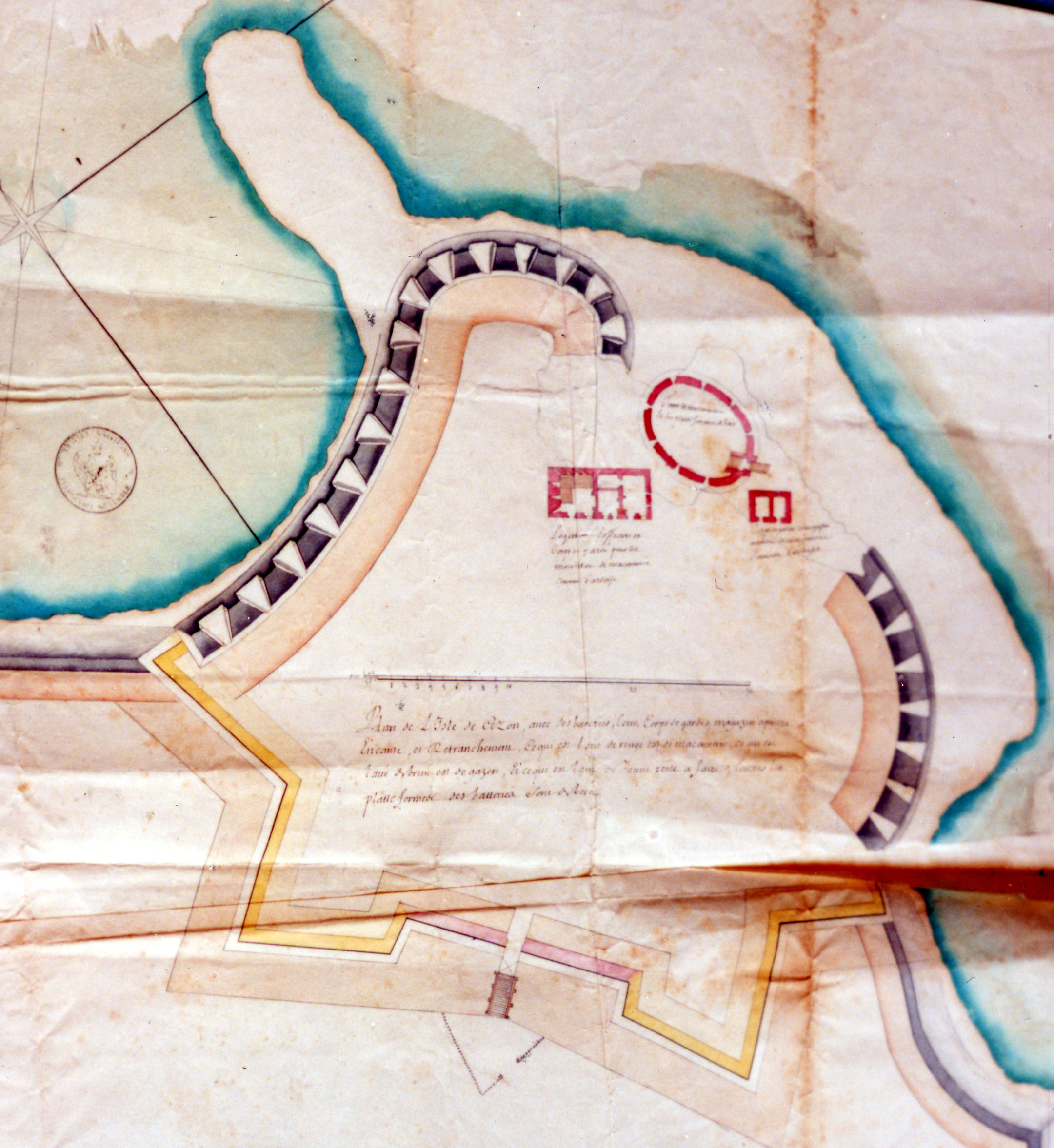 Détail du plan du fort Cézon avec ses batteries, cour, corps de garde, magasins, enceinte et retranchement, entre 1697 et 1704, auteur inconnu, Service Historique de la Marine, Vincennes, DD2-702 (Yann Le Nestour - association Cézon, document n° 40)Immatriculation