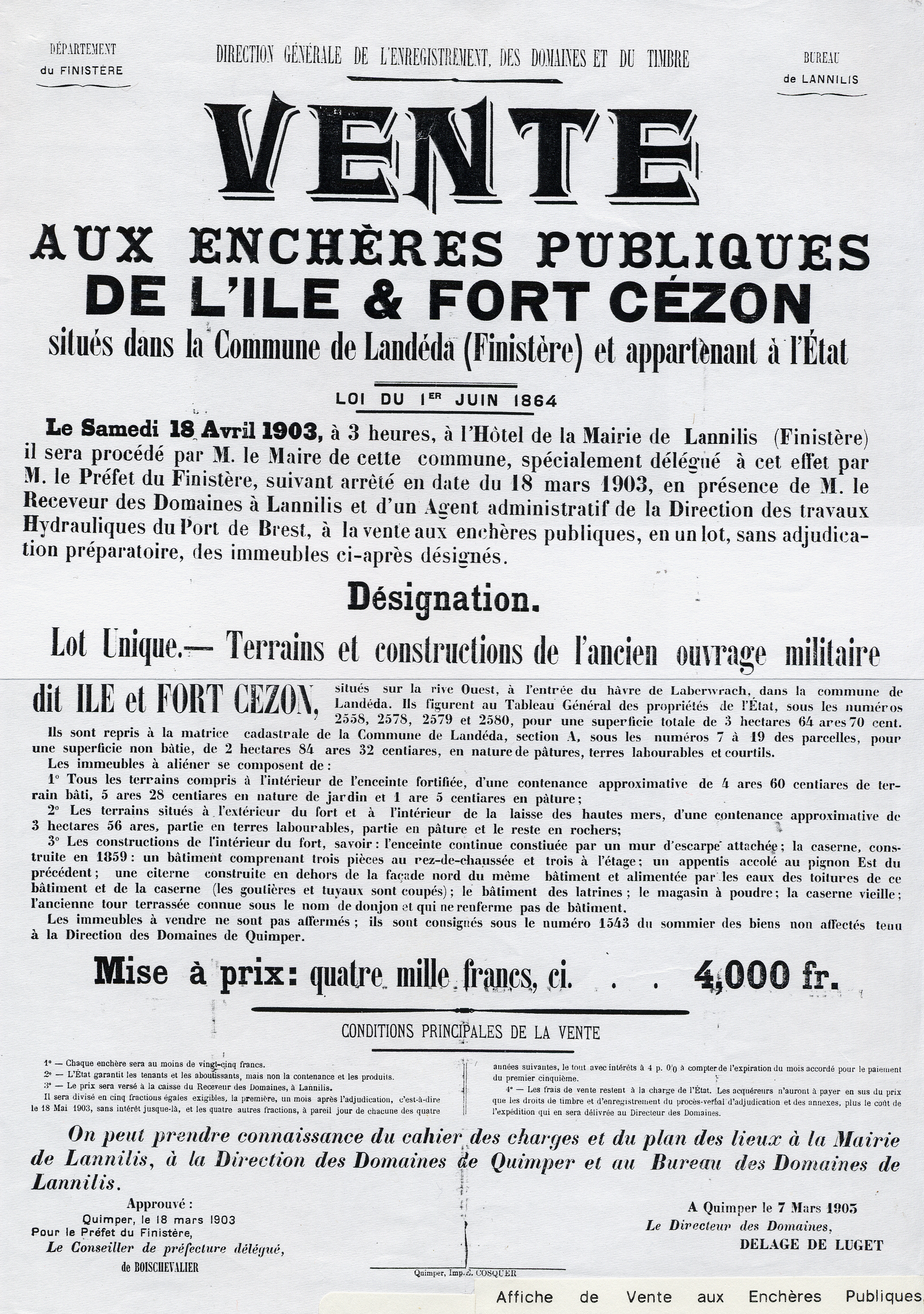 Affiche de la vente aux enchères publiques de l'île et fort Cézon, 1904 (collection association Cézon)Immatriculation