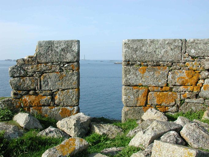 Vue de la tour d'artillerie du fort Cézon : créneau. En arrière-plan : le phare de l'île ViergeImmatriculation