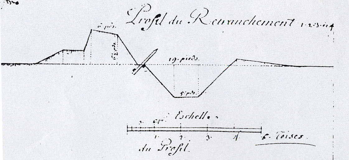 Coupe d'un retranchement, détail du plan à rabat du fort Cézon par Robelin, fait à Brest le 31 octobre 1704, Service Historique de la Marine, Vincennes, série MS, 144-266Immatriculation