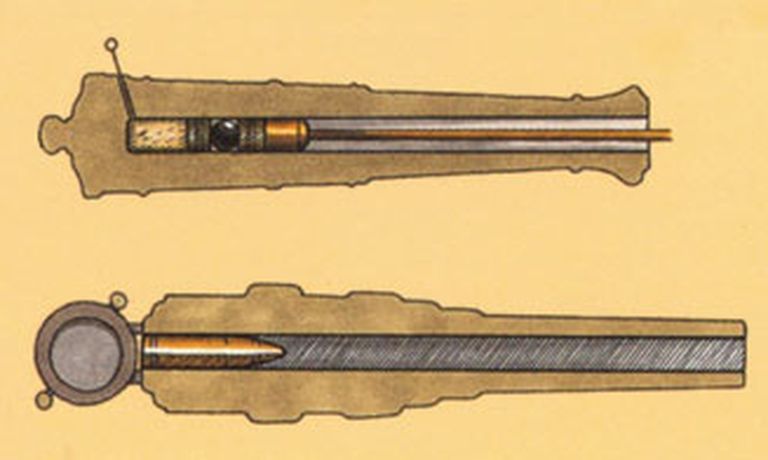 Fig. 11 - En haut : canon à boulets sphériques, à chargement par la gueule (XVIe-XIXe s.). En bas : canon rayé à chargement par la culasse, propulsant un obus allongé (après 1858), Archéam, n° 10, 2002-2003Immatriculation