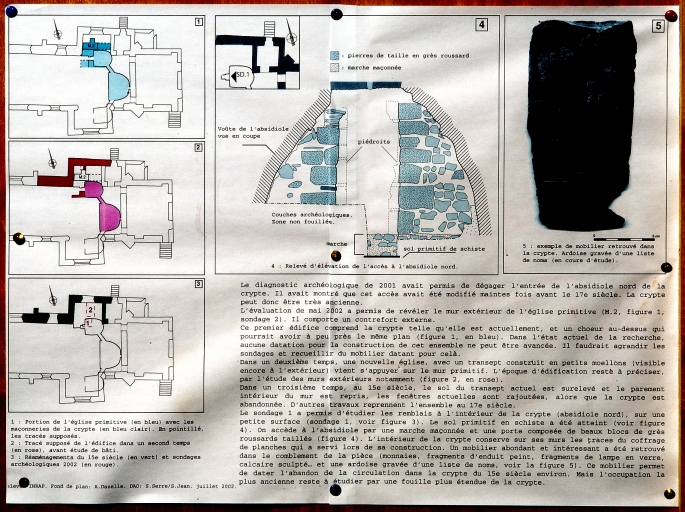 Chantier de fouilles : plan de la crypte, relevé INRAP (A. Dazelle, S. Serre, S. Jean), juillet 2002Immatriculation