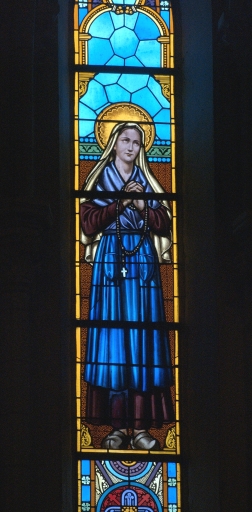 Ensemble de 6 verrières à personnages des chapelles latérales (baies 7 à 12) : Notre-Dame de Lourdes, Sainte Thérèse d'Avila, Sainte Bernadette, Sainte Thérèse de l'Enfant-Jésus, Saint Jean, Sainte Elisabeth de Hongrie,
