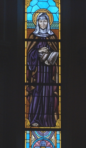 Ensemble de 6 verrières à personnages des chapelles latérales (baies 7 à 12) : Notre-Dame de Lourdes, Sainte Thérèse d'Avila, Sainte Bernadette, Sainte Thérèse de l'Enfant-Jésus, Saint Jean, Sainte Elisabeth de Hongrie,