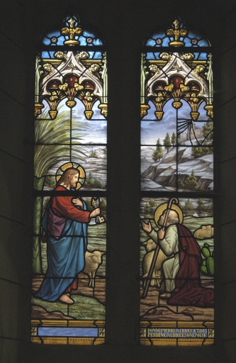 Ensemble des 19 verrières à personnages des baies 1 à 12, 14, 101 et 102 et des verrières décoratives des baies 103, 104 et 00,