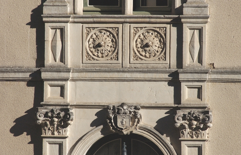 Façade sud : détail de l'allège au-dessus de la porte d'entrée (armoiries)Immatriculation