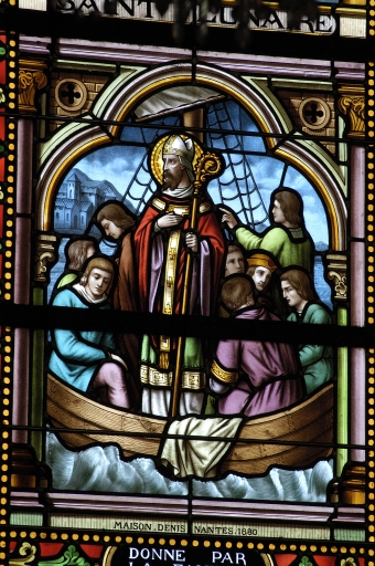 Ensemble des 9 verrières à personnages des baies 0 à 8 : Sacré Coeur, Saint Méen, Saint Laurent, Saint Lunaire, Saint Isidore, Saint François d'Assise, Saint Louis de Gonzague, Vie de la Vierge, et des 7 verrières décoratives de la nef,