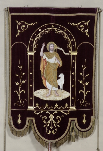 Bannière de procession paroissiale : Bienheureux Louis-Marie Grignion de Montfort, Saint Jean-Baptiste,