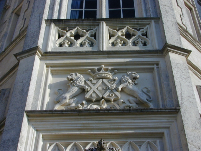Porte d'entrée, armoiries des commanditaires : détailImmatriculation