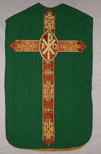 Ornement vert 2 : chasuble, bourse de corporal, étole, manipule,