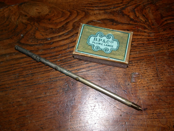 Bureau du prêtre : détail du porte-plume orné d'un saint MichelImmatriculation
