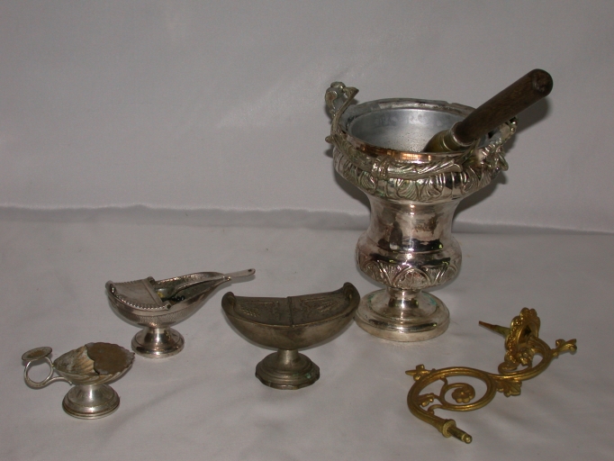 Coquille de baptême, 2 navettes à encens, seau à eau bénite, porte-luminaire d'appliqueImmatriculation