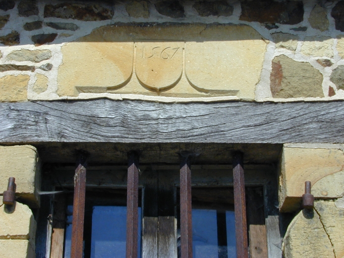 Façade antérieure, fenêtre de la salle : détail du linteau gravé d'une date dans un écuImmatriculation