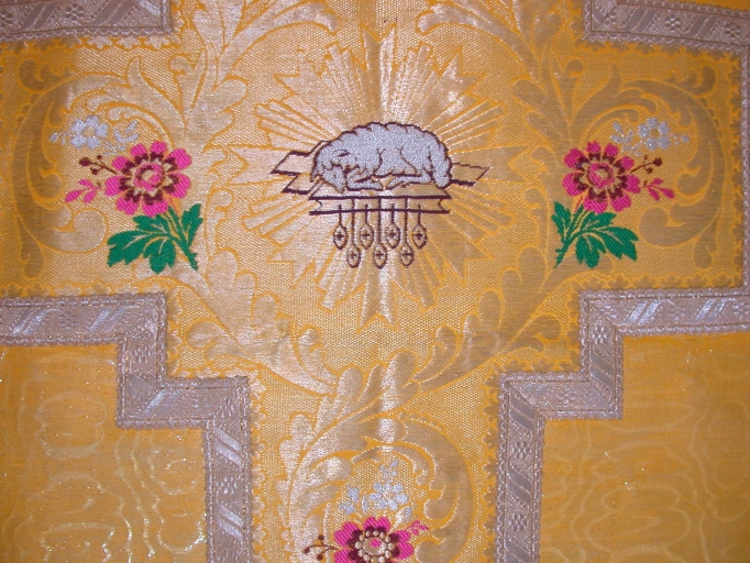Dos de la chasuble, détail du décor : Agneau aux 7 sceauxImmatriculation