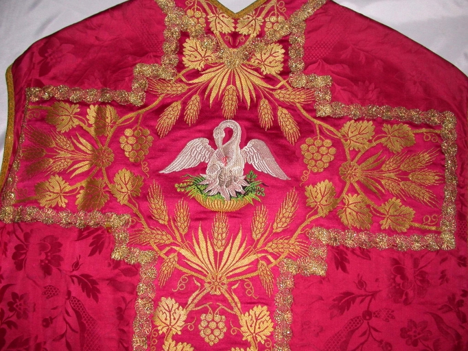 Ornement rouge 1 : chasuble, étole, manipule, voile de calice,
