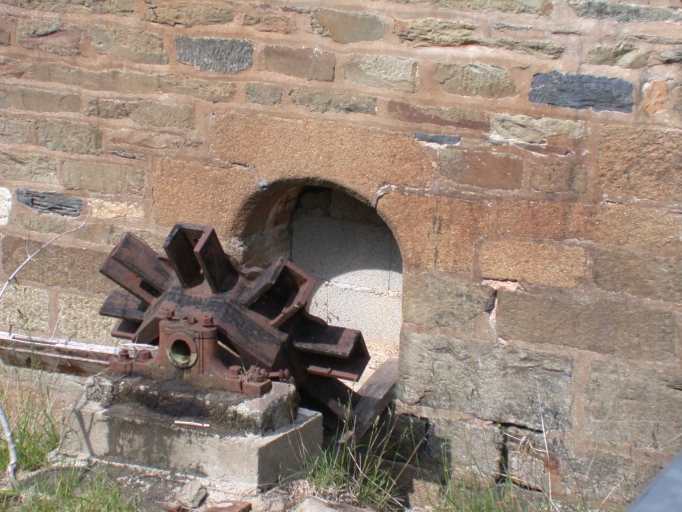 Moulin, partie basse du côté coursier : détail de l'axe de l'arbre de la roueImmatriculation