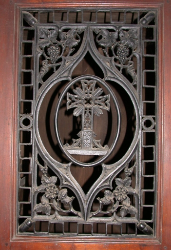 Décor en fonte du portillon : croix, vigne, ornementation végétaleImmatriculation