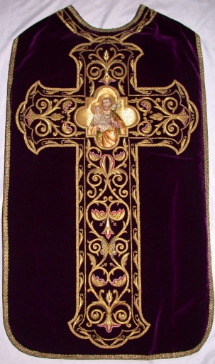 Ornement violet 1 : chasuble, bourse de corporal, manipule, voile de calice,