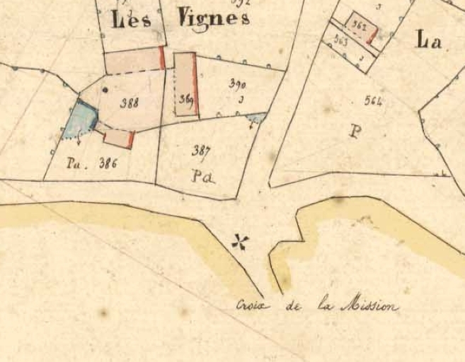 Croix de mission sur le cadastre de 1845, située à l'emplacement du café actuelImmatriculation