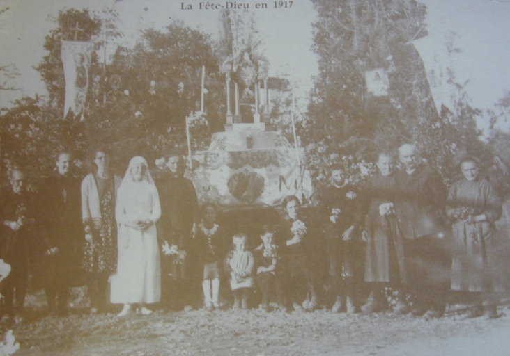 La fête Dieu de 1917 sur une carte postale ancienne, croix en arrière-planImmatriculation