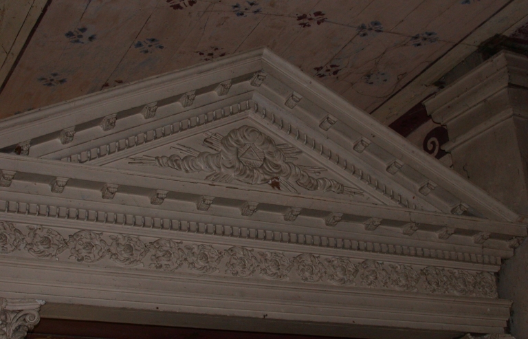 Vue latérale nord : fronton orné du triangle mystiqueImmatriculation