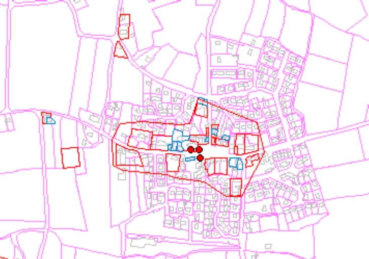 Les édifices recensés projetés en bleu et rouge sur le cadastre actuelImmatriculation