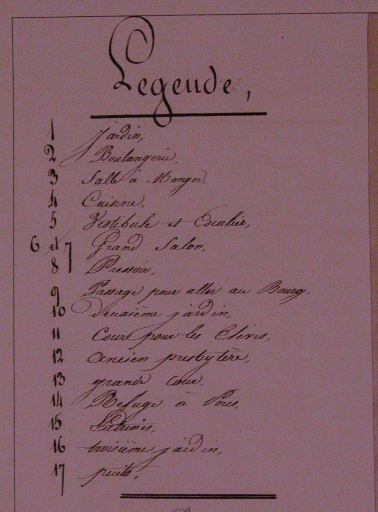 Le plan du presbytère en 1838 ; légendeImmatriculation