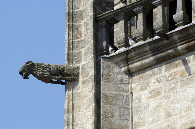 Tour-porche, détail balustrade du clocher et gargouille.Immatriculation