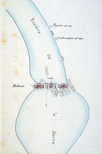 Plan de détail de la pêcherie sur la Sarre près de Kerbihan, 1859 (AD Morbihan, S1100).Immatriculation