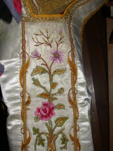 Détail d'une chasuble en soie blanche : application et remploi d'une broderie en fils de soieImmatriculation