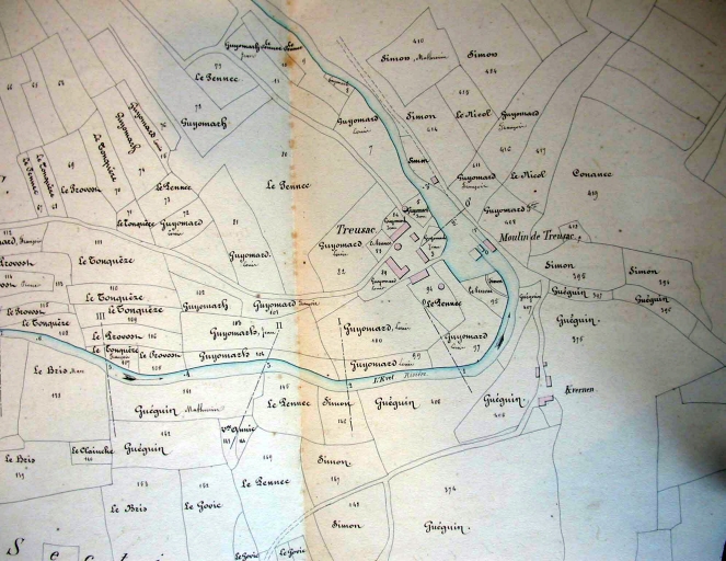 Moulin de Treusac'h. Projet de règlement d'eau : plans de l'usine et de ses abords, 22 avril 1858 (AD Morbihan, S 1062)Immatriculation
