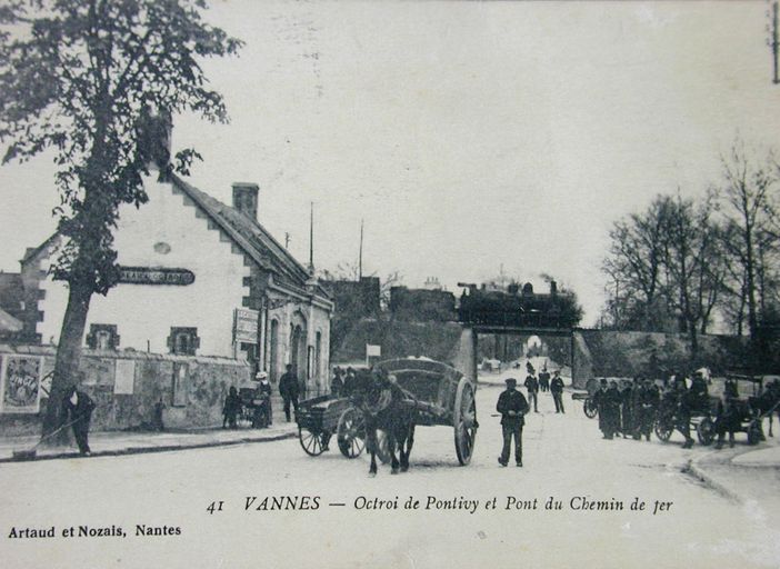 Bureau d'octroi de la route de Pontivy et pont de la gare de Vannes. Carte postale ancienne. Collection Artaud et Nozais, Nantes. AM Vannes 7Fi.Immatriculation