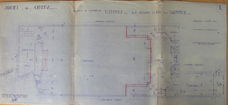 Projet de cinéma par Perrin, 1935 : plan du RDC. AD Morbihan 2 O 260/18.Immatriculation