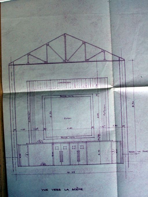 Plan intérieur du cinéma : vue vers la scène. AD Morbihan 2 O 260/18.Immatriculation