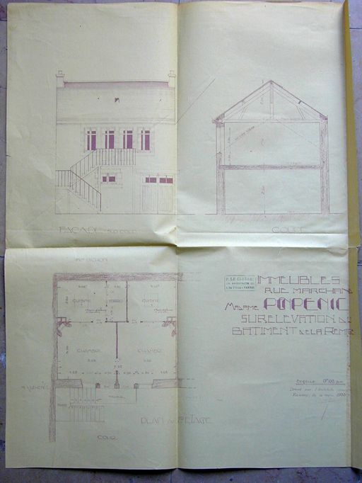 Plan de la surélévation par Le Cloërec pour madame Penpenic, 1933. AM Vannes 5 I162.Immatriculation