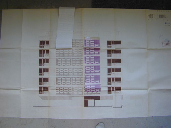 Elévation de la façade sur rue de l'immeuble par Guillou, 1960. AM Vannes 1G59.Immatriculation