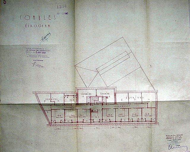 Plan des combles par Guillou, 1947. AM Vannes 1G59 et AD Morbihan 110J4487.Immatriculation
