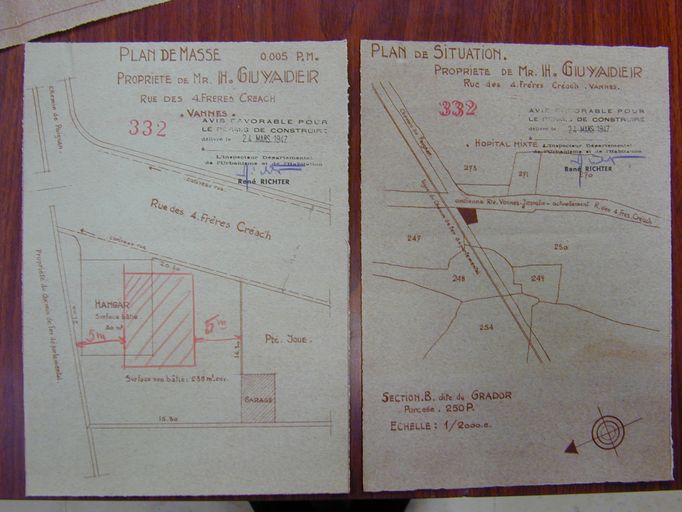 Plan de masse et de situation d'un hangar construit pour Mr Guyader par Ch. Perrin en 1947, détruit aujourd'hui. AM Vannes 1G59.Immatriculation