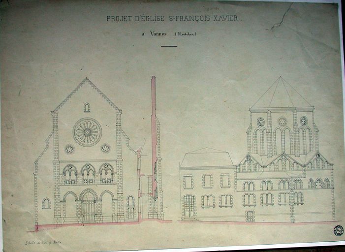 Projet d'église : élévation de la façade et du chevet par le révérend père Tournesac(n.d.). Fonds Saint-François-Xavier. AM Vannes.Immatriculation