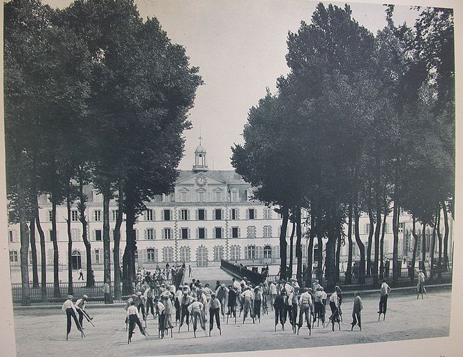 Vue du bâtiment des études donnant sur les grandes cours de récréations vers 1900 dans l'album des 50 ans. Fonds Saint-François-Xavier. AM Vannes.Immatriculation