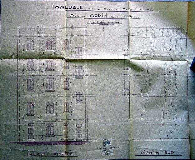 Projet d'élévation de la façade postérieure par Le Cloërec, 1939. AM, Vannes 5 I 162.Immatriculation