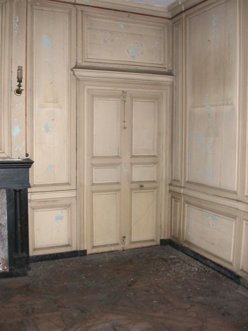 Etage, pièce sud, porte d'angle nord-est et lambris.Immatriculation