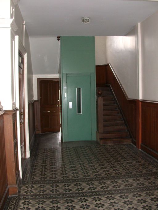 Vue intérieure de l'entrée de l'immeuble avec escalier et ascenseur.Immatriculation