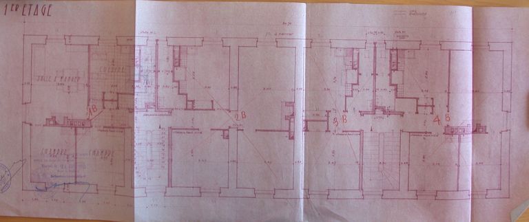 Transformation de l'ancienne infirmerie en HLM. Projet de Yves Guillou, 1949. Plan de l'étage. AD Morbihan 110 J 4013.Immatriculation