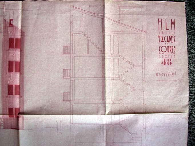 Réalisation de 128 logements HLM. Projet de Yves Guillou, 1954. Coupes. AD Morbihan 110 J 4033.Immatriculation